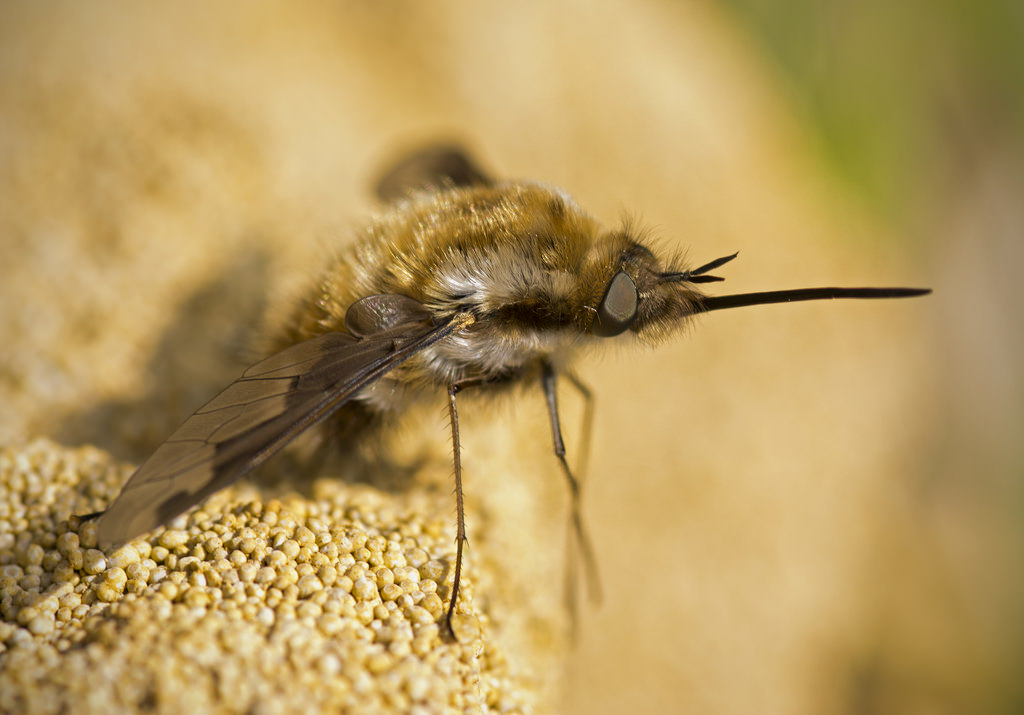Adult Bee Flies are adapted for a pollen and nectar diet, and their physiology shows it. They have small bodies which range in length from 1mm to 2.5cm, depending on the species. Their wingspan can be as small as 1.5mm, though larger species can have a span of more than 60mm. Many species utilize biomimicry, in terms of their coloration, often resembling bees (hence their common name as the Bee Fly) or wasps. This offers them protection, as their predators assume that they have the temperament of a more aggressive species. Nonetheless, some species simply have a solid coloration of grey or rusted brown. Bee Flies’ wings appear swept back when at rest, and their legs are generally long and skinny compared to their body, with bristles at the ends. Many Bee flies are equipped with a very long proboscis (tubes that enable them to lap up nectar) that allows them to collect nectar from flowers with long narrow floral tubes. The Bee Flies’ proboscis is fixed, and cannot be retracted, giving it a tusk-like resemblance.