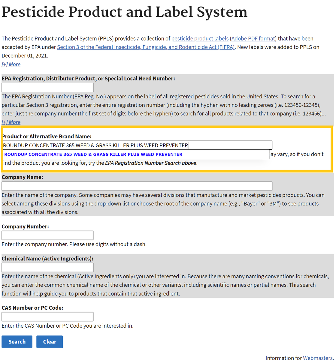 - Go to U.S. EPA's Pesticide Product and Label System and enter the product name. The generic product name may vary.