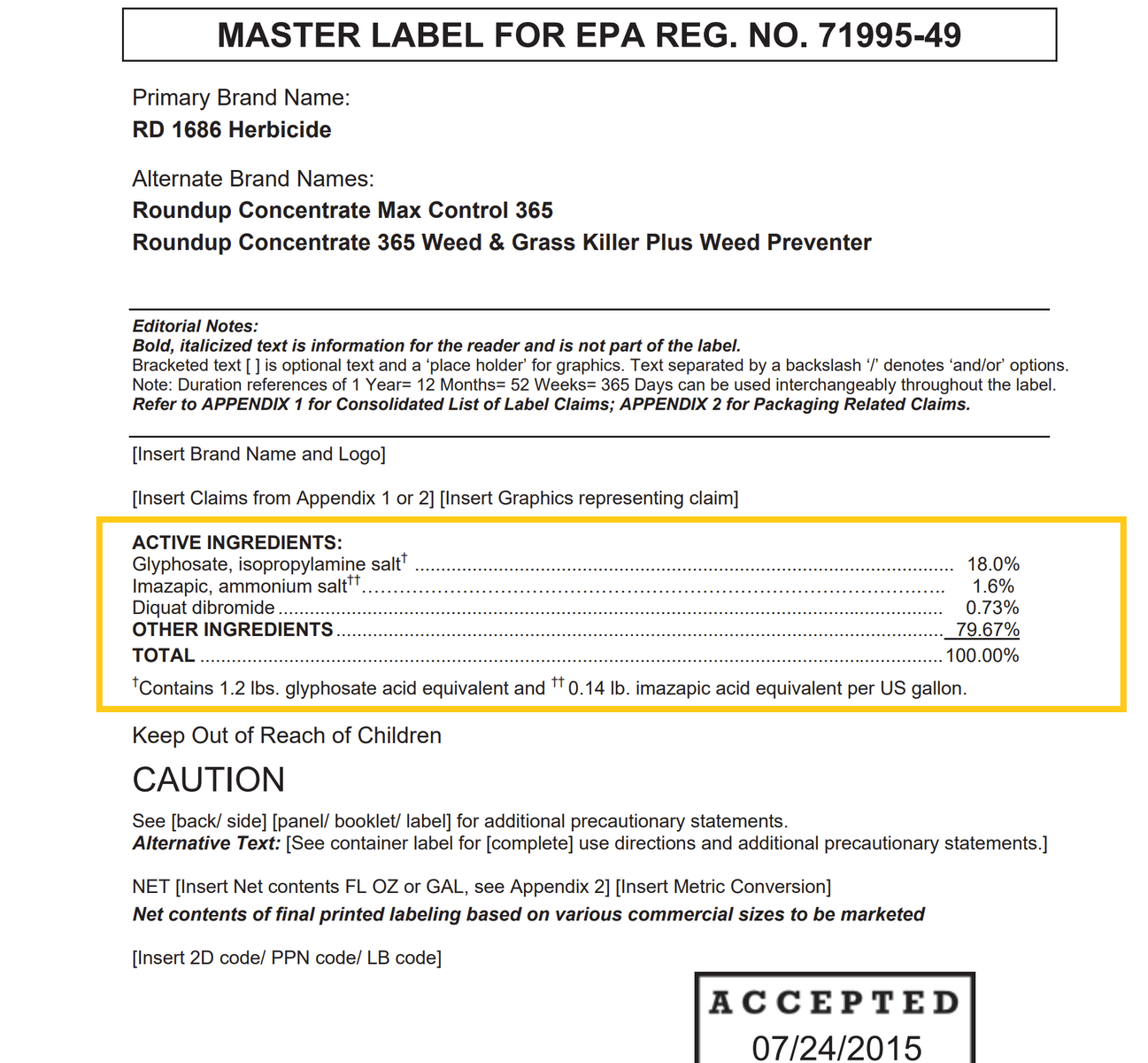 - To find the active ingredient(s) on the label, search for the page in the document containing the date of registration. Usually, the active ingredients section occurs within the first few pages of the label document.