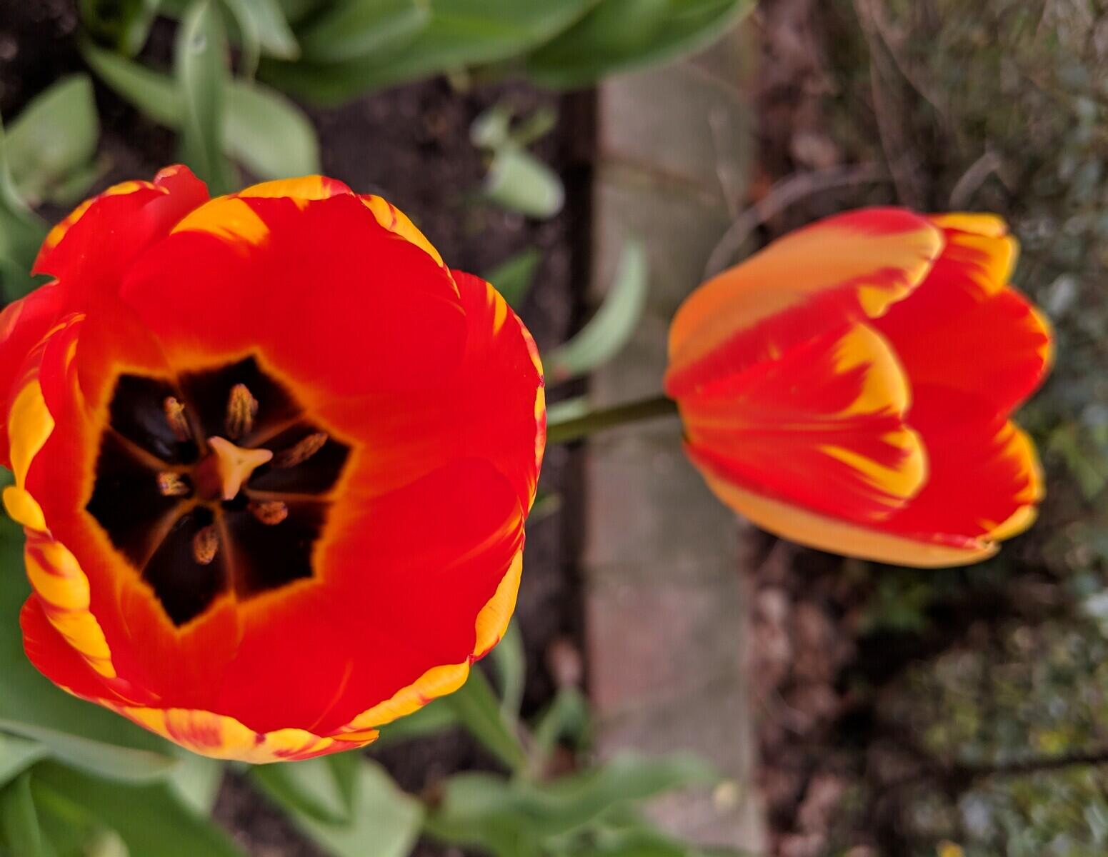 | Title: "Caterpillar in Flower Garden" | Title: "Tulip Curved Row in Charlotte's Garden" |